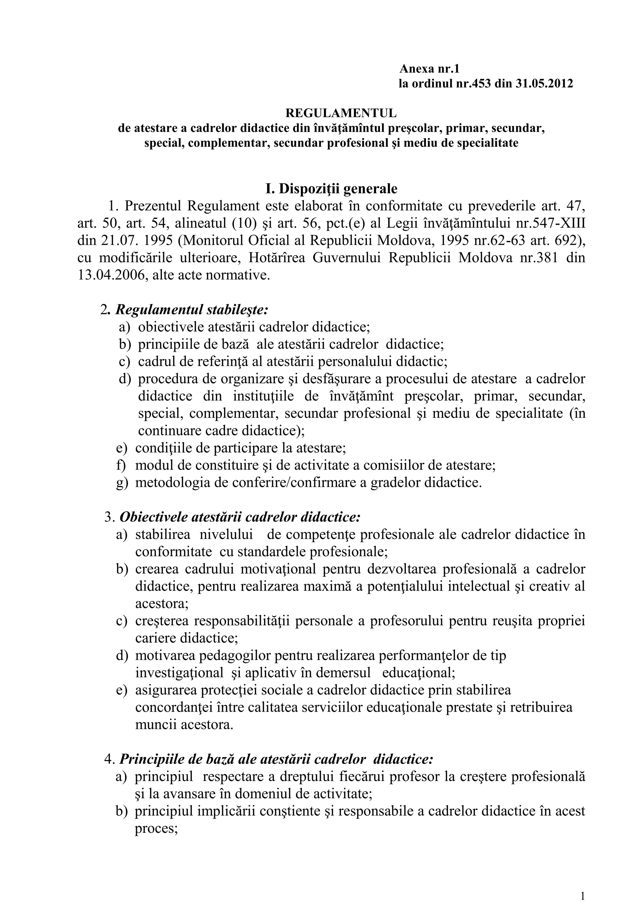 Regulamentul de atestare a cadrelor didactice din învăţământ stabilește obiective, principii și proceduri esențiale pentru evaluarea profesională a profesorilor din diverse niveluri educaționale. Atestarea se realizează o dată la 5 ani, fiind obligatorie pentru confirmarea în funcție și benevolă pentru obținerea gradelor didactice, implicând evaluări de către comisii specializate. Documentul include detalii despre drepturile cadrelor didactice, cerințele pentru obtinerea gradelor și responsabilitățile comisiilor de atestare.