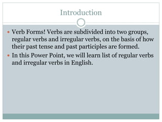 The document provides an introduction to regular and irregular verb forms in English, explaining how regular verbs typically form their past tense and past participles by adding -d or -ed. It also lists several examples of both regular and irregular verbs, highlighting that irregular verbs do not follow a predictable pattern for their past forms. The content is structured as a PowerPoint presentation prepared by an English department.