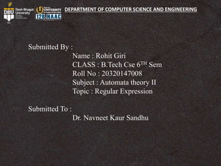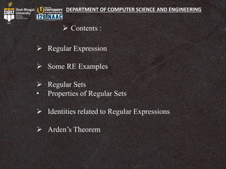 The document discusses regular expressions and their properties. It begins with defining regular expressions recursively and provides examples. It then discusses properties of regular sets such as their unions, intersections, complements being regular. It also discusses identities related to regular expressions and proves Arden's theorem. Finally, it solves a problem to find the regular expression for a given automaton using Arden's theorem.