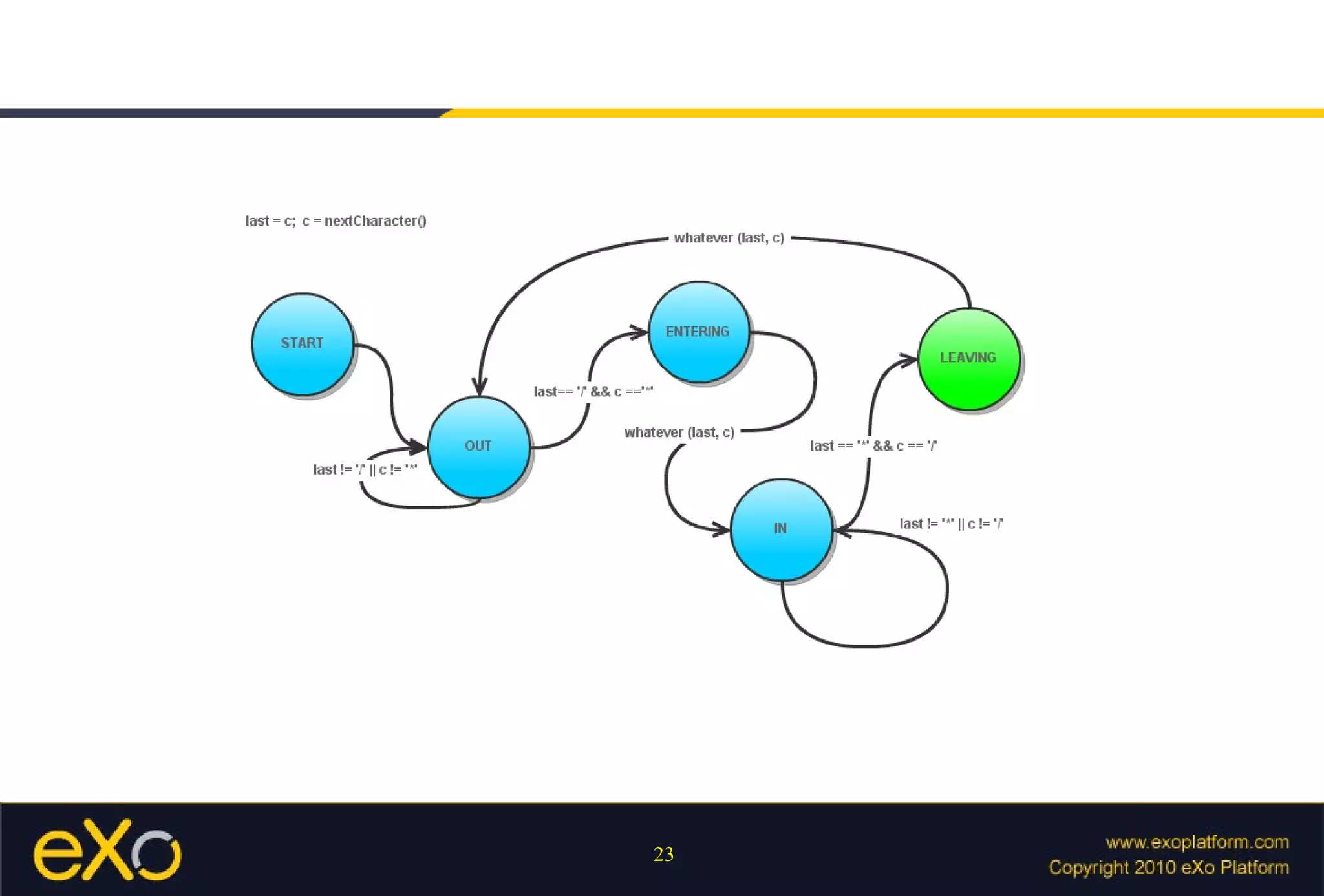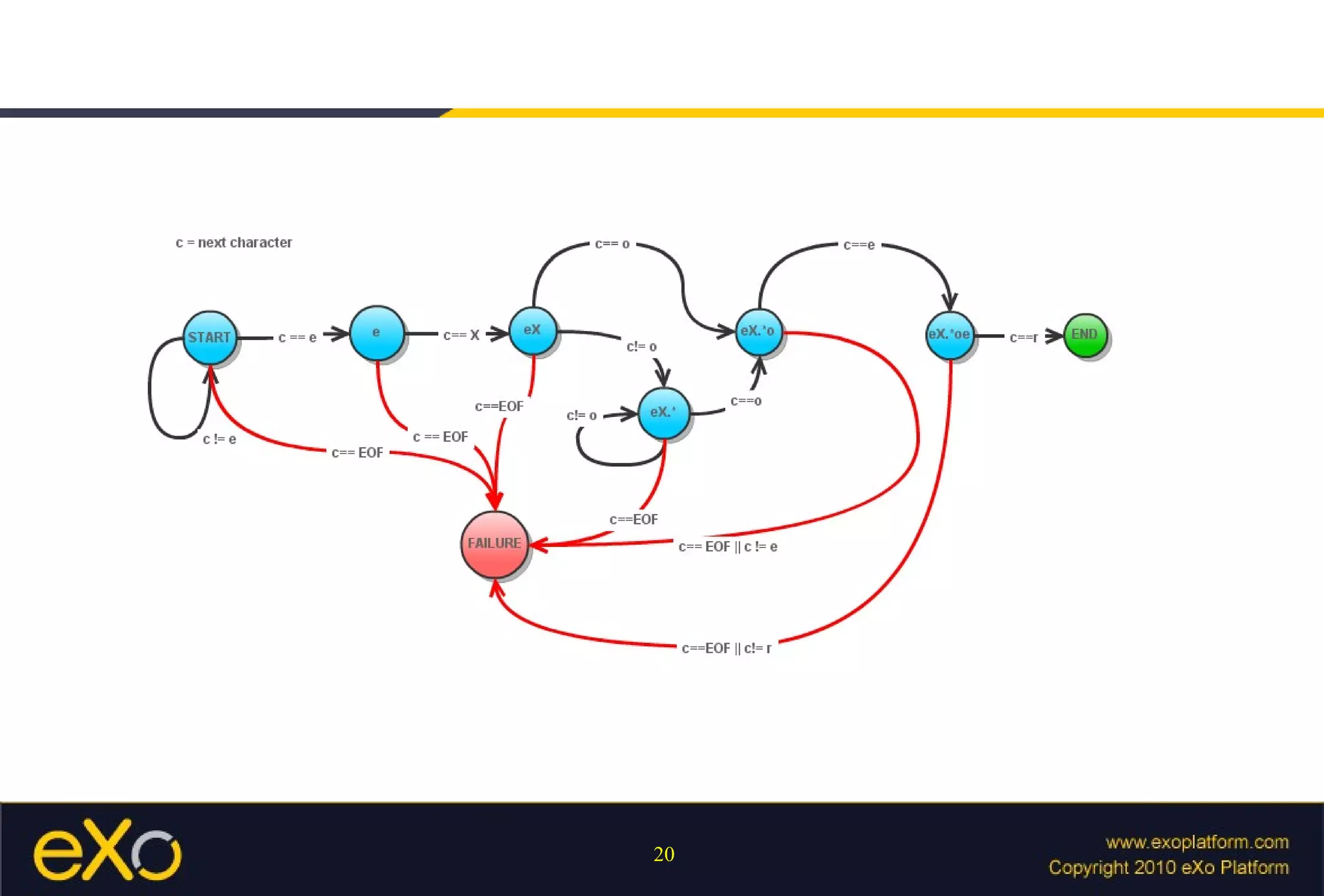 The document discusses using finite state machines to parse patterns and regular expressions, providing examples of how a finite state machine can recognize patterns in text. It also covers how Java's regex API implements pattern matching using finite state machines under the hood. Additional topics include capturing groups, operators, and using parsers in the GateIn framework.