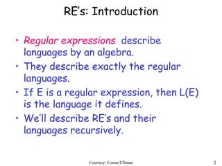 Regular expressions describe regular languages using three operations: union, concatenation, and Kleene star. They can be defined recursively, where primitive expressions define single symbols and the empty string, and operations combine expressions. Regular expressions generate regular languages, and any regular language can be defined by a regular expression. Converting between regular expressions and finite automata allows regular languages to be represented in different standard forms.