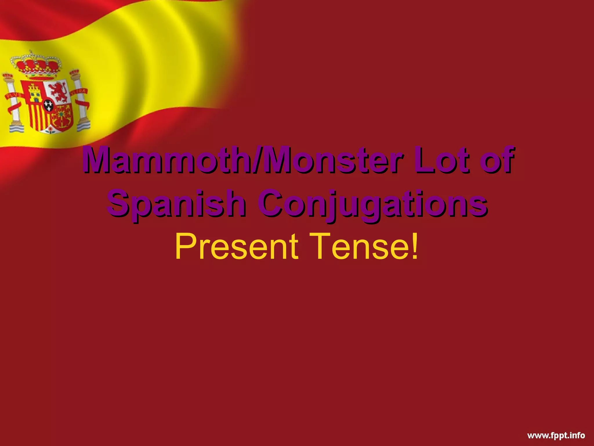 This document provides an overview of Spanish verb conjugations in the present tense. It explains that Spanish verbs are categorized into three main groups (-ar, -er, -ir) and lists the endings for each. It notes that there are also many irregular verbs that do not follow the typical patterns. In addition, it states that while the present and preterite tenses contain numerous irregular verbs, other tenses have fewer irregularities.