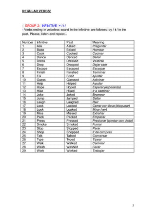 The document summarizes the three different ways that regular verbs are pronounced in their past form in English. Group 1 verbs ending in voiced sounds add "d", Group 2 verbs ending in voiceless sounds add "t", and Group 3 verbs ending in "t" or "d" sounds add "id". Examples are provided for numerous verbs in each group along with their infinitive and past tense forms as well as an English translation.
