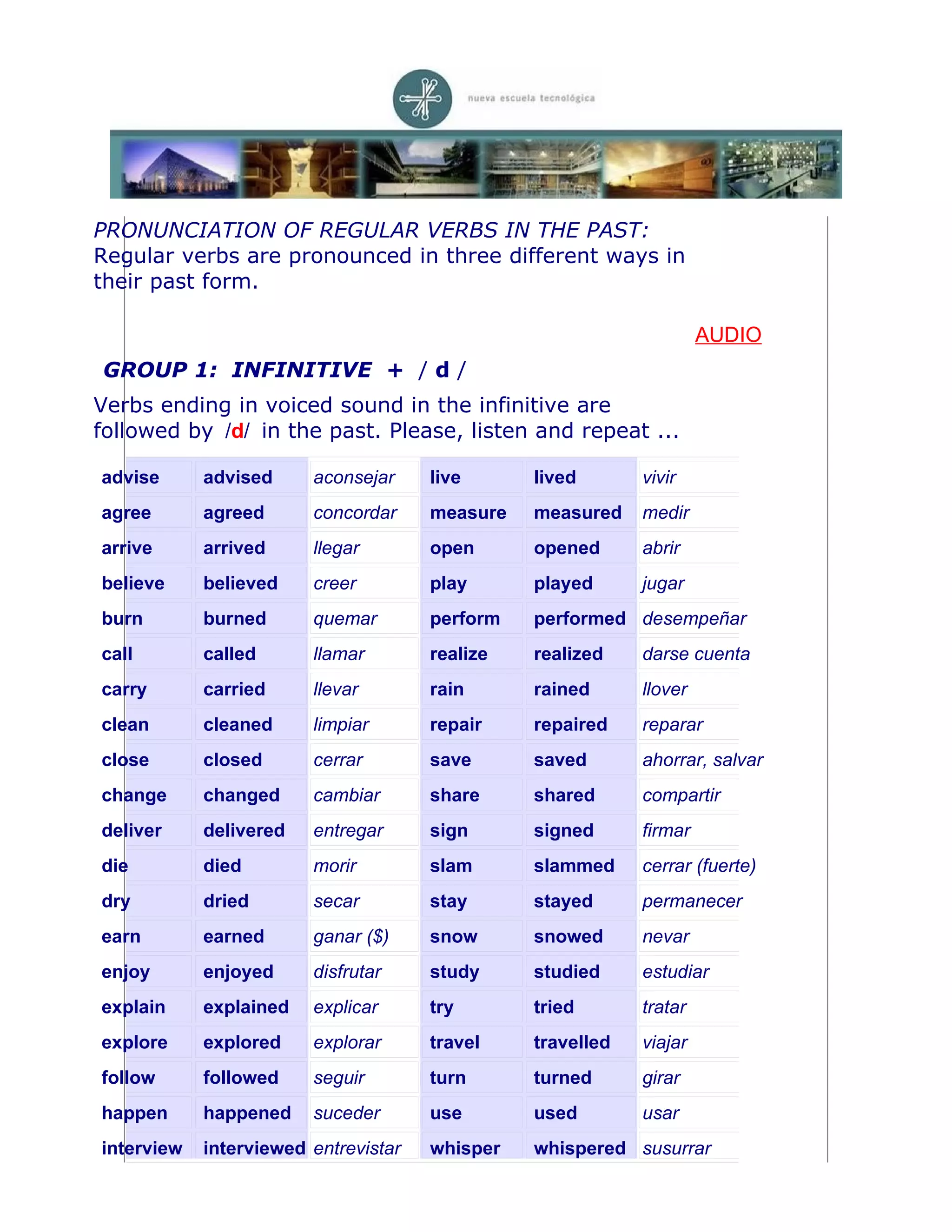 Regular verbs are pronounced in the past tense in three different ways. Group 1 verbs ending in voiced sounds add "d", Group 2 verbs ending in voiceless sounds add "t", and Group 3 verbs ending in "t" or "d" sounds add "id". The document provides examples of common English verbs that follow each of the three patterns.