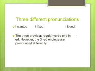 This document discusses the three different pronunciations of the "-ed" ending on regular past tense verbs in English. It states that "-ed" is pronounced as /t/ when the verb stem ends in a voiceless sound, as /d/ when the verb stem ends in a voiced sound, and as /ɪd/ when the verb stem ends in /t/ or /d/. Examples are provided to illustrate each rule, such as "watched", "loved", and "wanted" respectively. The purpose is to explain the different ways of pronouncing the regular past tense "-ed" ending in English.