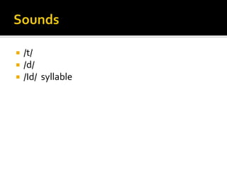 This document provides pronunciation rules for regular verb conjugations in the past tense. It outlines three categories: verbs ending in voiceless sounds like /t/ are pronounced with /t/ in the past tense; verbs ending in voiced sounds like /d/ are pronounced with /d/ in the past tense; and verbs ending in /t/ or /d/ add /Id/ to form the past tense. Examples are given for verbs in each category, like "ask" becoming "asked" (/askt/), "learn" becoming "learned" (/learnd/), and "commit" becoming "commited" (/commitId/).