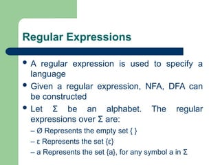 The document explains the relationship between regular expressions, finite automata, and regular grammars. It outlines how to construct non-deterministic finite automata (NFA) and deterministic finite automata (DFA) from regular expressions, and illustrates various examples of regular expressions over a binary alphabet. Additionally, it details the identities and precedence of regular expression operators.