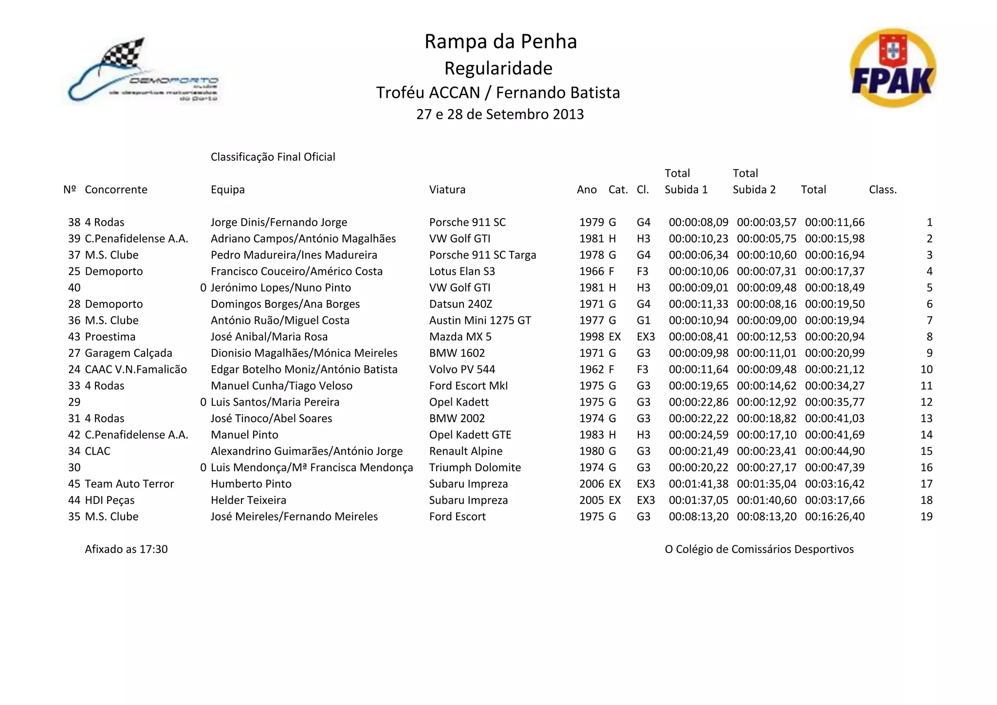 This document provides the results of a car rally that took place on September 27-28, 2013 in Rampa da Penha, Portugal. It lists the 19 competitors, their vehicles, years, categories and class, as well as their individual times in the two stages of the rally and their total times. Jorge Dinis and Fernando Jorge won the rally in a 1979 Porsche 911 SC with a total time of 11 minutes and 66 seconds.