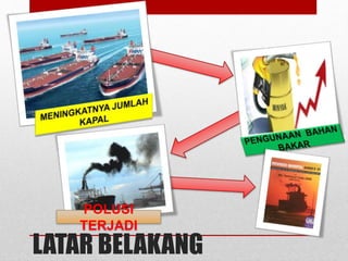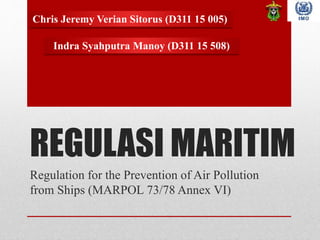 Dokumen ini membahas regulasi MARPOL Annex VI yang bertujuan membatasi polusi udara dari kapal melalui pengaturan emisi SOx dan NOx. Peraturan ini mencakup efisiensi energi dan modifikasi teknis yang diperlukan untuk memenuhi standar emisi yang ketat. Penerapan Annex VI menjadi tantangan bagi negara maritim untuk menjaga kualitas udara demi keberlangsungan generasi mendatang.