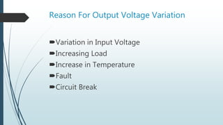 The document discusses various types of voltage regulators, including zener diode, series, and shunt voltage regulators. It provides details on how each type works to maintain a constant output voltage despite variations in input voltage or load current. Specific integrated circuits that can be used to build voltage regulators are also covered, such as the LM78xx, LM340, and LM317. The purpose of a voltage regulator is to keep the output voltage stable for downstream components in the face of changes to factors like the input voltage, temperature, or load current.