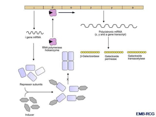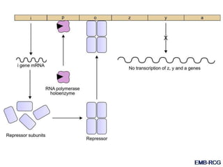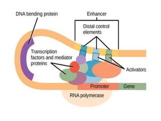 The document discusses the regulation of gene expression, detailing mechanisms in both prokaryotes and eukaryotes, including transcription, RNA modification, and translation. Key regulatory components such as operons, enhancers, and silencers are explained, highlighting their roles in gene expression control. It also covers methods like gene amplification and alternative splicing that contribute to protein diversity and functional adaptation in organisms.
