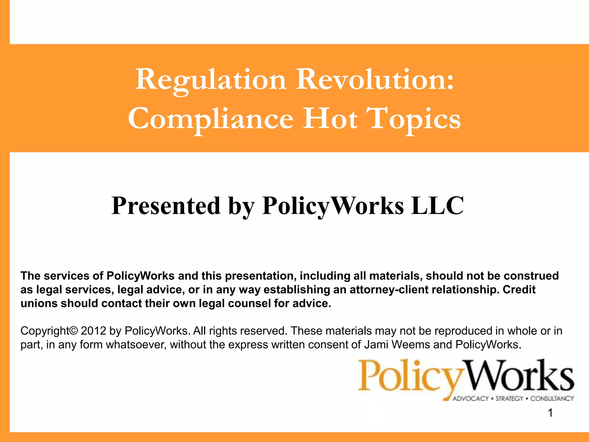 The document summarizes key topics from a presentation on regulatory compliance given by PolicyWorks LLC. It discusses the impact of the Dodd-Frank Act, the Consumer Financial Protection Bureau (CFPB) and its director Richard Cordray, CFPB priorities including complaints, student loans, credit cards, mortgages, and overdraft fees. It also covers the CFPB's work on ability-to-repay rules, mortgage disclosures, and fair lending laws.
