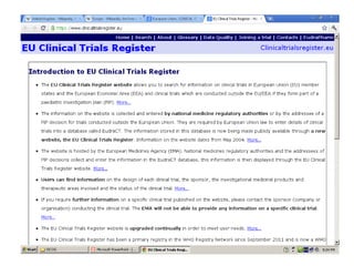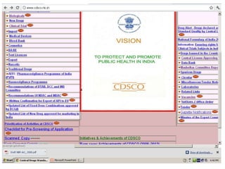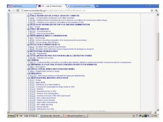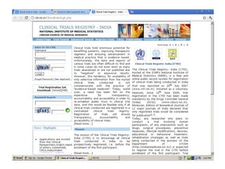 The document discusses regulations for clinical trials in India. It begins by explaining that an Investigational New Drug Application (IND) provides an exemption that allows investigational drugs to be transported across state lines for clinical trials. It then describes the process of submitting an IND to the FDA, including providing animal studies data, manufacturing information, clinical protocols, and investigator information. It notes that the FDA has 30 days to review submitted INDs. Finally, it summarizes that in India, an application for clinical trials should be submitted to the DCGI along with chemistry, manufacturing, animal study data and other required documents and trial protocols, and trials can only begin after approval from the DCGI and ethics committee.