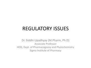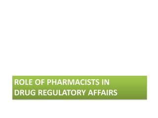This document discusses the role of pharmacists in drug regulatory affairs in India. It provides an overview of the various drug regulatory authorities and committees in India, including the Central Drugs Standard Control Organization (CDSCO), Drug Technical Advisory Board (DTAB), and Drugs Consultative Committee (DCC). It also outlines some of the key regulations under the Drugs and Cosmetics Act, including licensing requirements for manufacturing, importing, and distributing drugs. Pharmacists can work in areas like quality control, quality assurance, regulatory affairs, and other roles for the pharmaceutical industry and drug regulatory agencies.