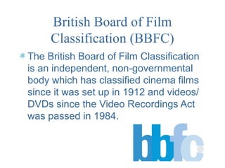 This document discusses several regulatory and professional bodies that govern the UK media sector, including the British Board of Film Classification which rates films and videos, the British Video Association which represents video publishers and rights owners, and the Film Distributors Association which represents UK film distributors. It also mentions the Video Standards Council, Ofcom as the communications regulator, Trading Standards which protects consumers, the Press Complaints Commission which handles press complaints, and the Advertising Standards Authority which regulates advertising across all media.