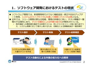 All Rights Reserved. 1.ソフトウェア開発におけるテストの現状 テスト⾃動化による作業の省⼒化への期待 ソフトウェア開発では、新規開発時だけでなく機能追加・修正やOSのアップデ ート時等、システムのライフサイクルを通じて頻繁にテストが必要となる。 近年では、リリース期間の更なる短縮、環境の多様化に伴い、テスト稼働が⼀層 増⼤する傾向にあり、テスト⾃動化による作業の省⼒化が期待されている。 • 既存機能への悪影響を確認する回帰テストは、同じテストをリリース毎に繰り返すう え、システム規模に応じて増⼤し続けるため、⾃動化による稼働削減が⼀層効果的 膨⼤な数のテストを 様々な環境で実施 ⼤量のテスト結果を 1つ1つ⽬視で確認 システムの仕様を理解して ⼤量のテストを作成 テスト設計 テスト実施 テスト結果確認