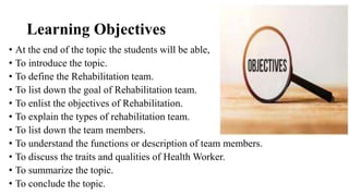 The document outlines the rehabilitation team, its objectives, and various types of members involved in the rehabilitation process. It defines rehabilitation and emphasizes the team's role in improving patient functioning and reducing disabilities. Key components include the team's structure, individual roles, and the importance of adapting care to meet patients' specific needs.