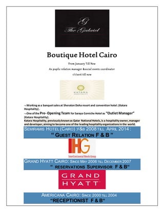 Reham Aly Mohammed is an Egyptian national born in 1977 in Cairo. She has over 14 years of experience in hospitality management positions at international hotel chains in Qatar, Egypt, and the UAE. Her roles have included banquet sales, events coordination, guest relations, and front office management. She is currently the public relations manager and social events coordinator for a boutique hotel in Cairo.