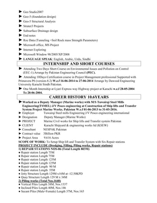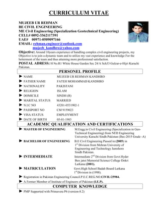 This curriculum vitae summarizes Mujeeb Ur Rehman's qualifications and experience. He has over 10 years of experience managing complex civil engineering projects. He holds a Master's degree in Civil Engineering with a specialization in Geotechnical Engineering from NED University and a Bachelor's degree in Civil Engineering from Mehran University. His experience includes roles as a Deputy Manager and Project Engineer on large projects such as construction of ship lifts and marine works for a nuclear power plant.