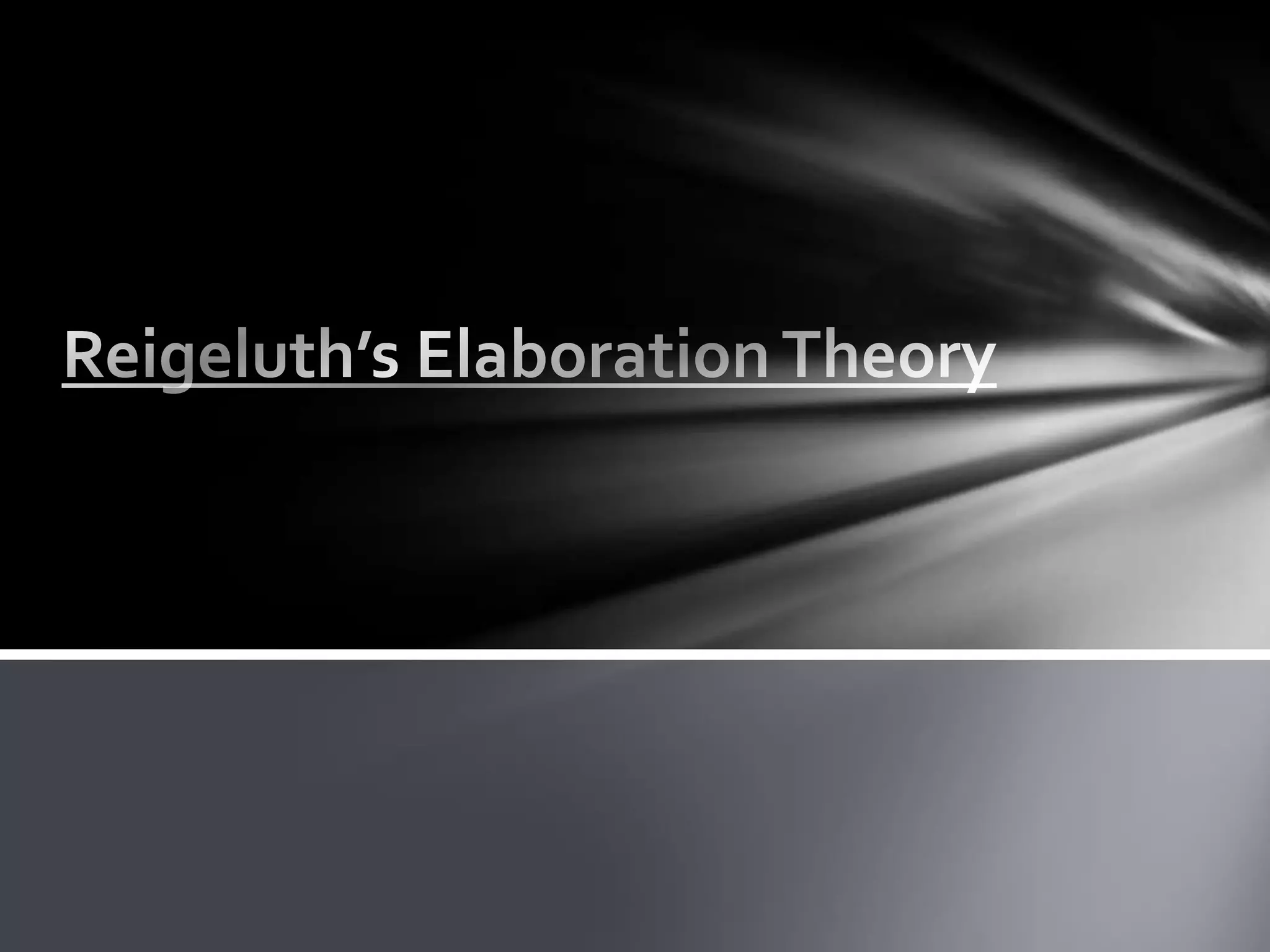 Charles Reigeluth developed Elaboration Theory, which focuses on improving retention and transfer of knowledge through sequencing content from simple to complex and concrete to abstract. The theory incorporates principles of cognitivism and behaviorism. Reigeluth's Elaboration Theory includes seven instructional treatments: elaboration, sequence, synthesizer, summarization, analogy, cognitive strategy activator, and learner control.