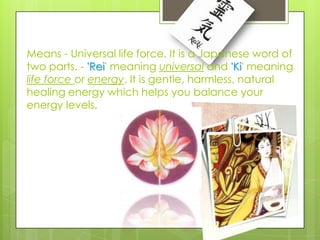 Reiki is a Japanese technique for stress reduction and relaxation that also promotes healing. It involves gentle laying on of hands to balance one's energy levels. Dr. Mikao Usui discovered Reiki in 1922 while meditating on Mount Kurama in Japan. He established the first Reiki healing clinic and taught Reiki to others. Although spiritual in nature, Reiki is not a religion. During a treatment, the practitioner channels Reiki energy to the client to restore the natural flow of life force energy and promote self-healing. Reiki is believed to benefit the chakras and corresponding organs by bringing them into balance.