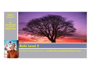 The document outlines a Reiki Level 2 Home Study Course, focusing on the second degree of Reiki. It covers foundational concepts such as Gassho, Reiji-ho, and Chiryo, which are essential rituals and practices in Reiki healing. The course emphasizes meditation, connection with the universal life force, and the transformative power of Reiki for practitioners.