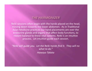 Reiki is a healing technique that works on the subtle vibrational body to restore balance. It involves intuitive hand placements by a practitioner to direct life force energy. Reiki sessions typically begin with hands placed on the head and face then moving down the body over organs and glands to restore balance to vital systems. Reiki is guided by intuition and allows the universal life force energy to flow through the practitioner to the recipient.