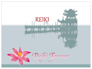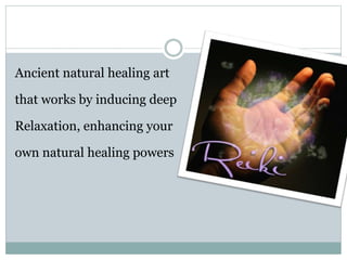 Reiki is an ancient natural healing art that works to induce deep relaxation and enhance one's natural healing abilities through the use of life force energy. It originated in 1922 in Japan when Dr. Mikao Usui developed the system. Reiki involves light touch on or near the body to unblock chi and promote healing. It follows five principles of non-aggression, non-worry, gratitude, integrity, and kindness. Reiki aims to balance the aura, which consists of etheric, astral, mental, and casual bodies, and seven chakras through the use of unconditional love.