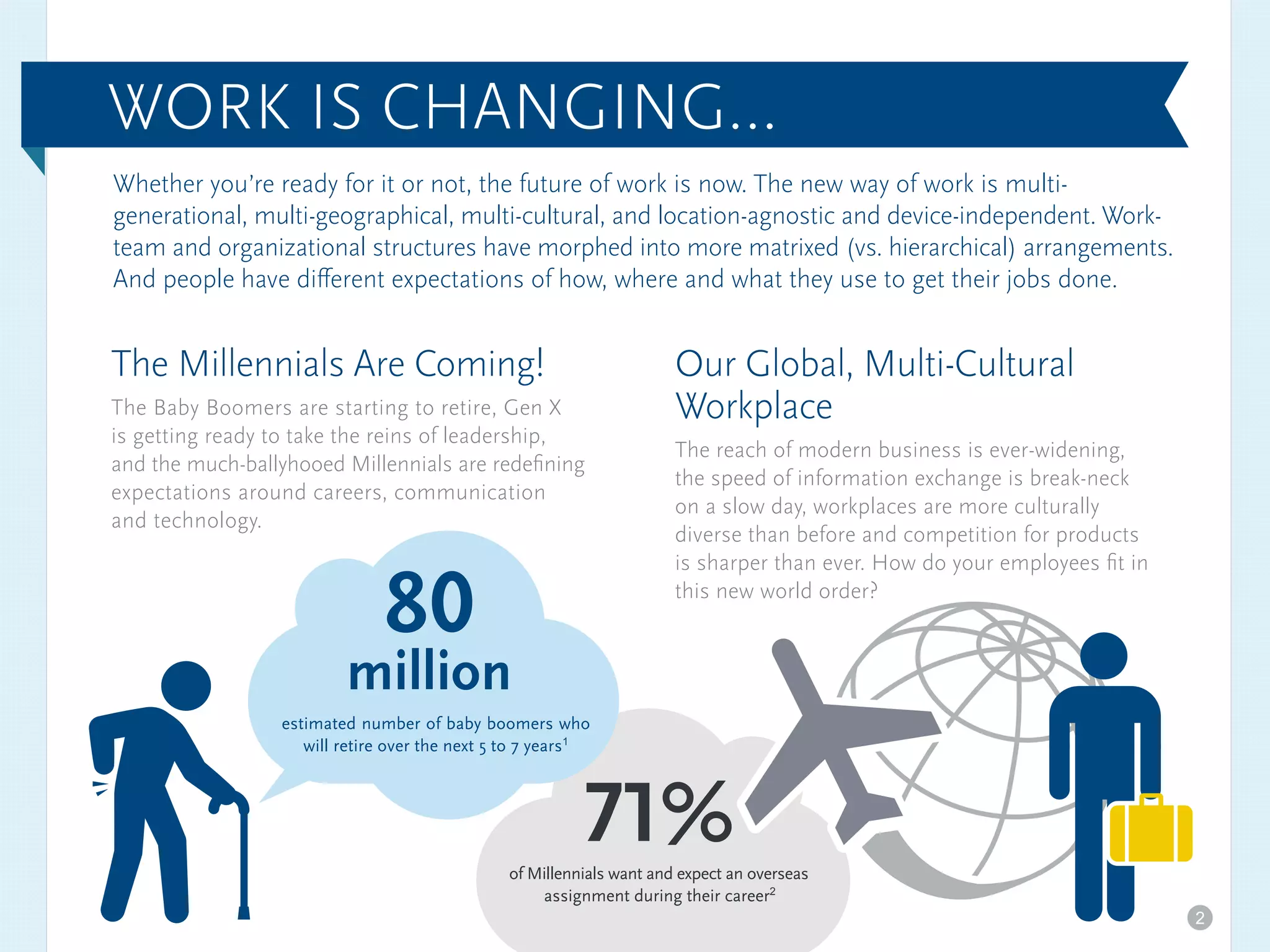 The document discusses the evolving landscape of work shaped by multi-generational, global, and technology-driven factors. It highlights the expectations of millennials regarding flexible work arrangements, continuous learning, and a collaborative work environment, which challenge traditional organizational structures. Companies must adapt to these changes to attract and retain talent and remain competitive in the modern workforce.