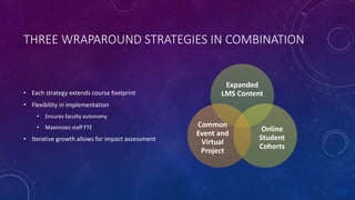 This document outlines three wrap around strategies to reimagine a general education psychology course: expanded LMS content, online student cohorts, and common events and virtual projects. The strategies are designed to extend the course footprint while ensuring faculty autonomy and maximizing staff. References and sources of inspiration are provided for each strategy.