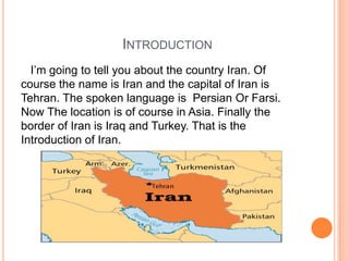 Iran is located in Asia, with Tehran as its capital. It has a diverse geography that includes plateaus, mountains, deserts, and bodies of water like the Caspian Sea. Iran has a long history dating back thousands of years, and was once ruled by various empires and dynasties. Iranian culture is rich with traditions around food, music, holidays, and conservative dress codes for women. While Iran offers opportunities to learn about its history and culture, the summary concludes that its strict rules make it less suitable for general travel or adventure seeking.