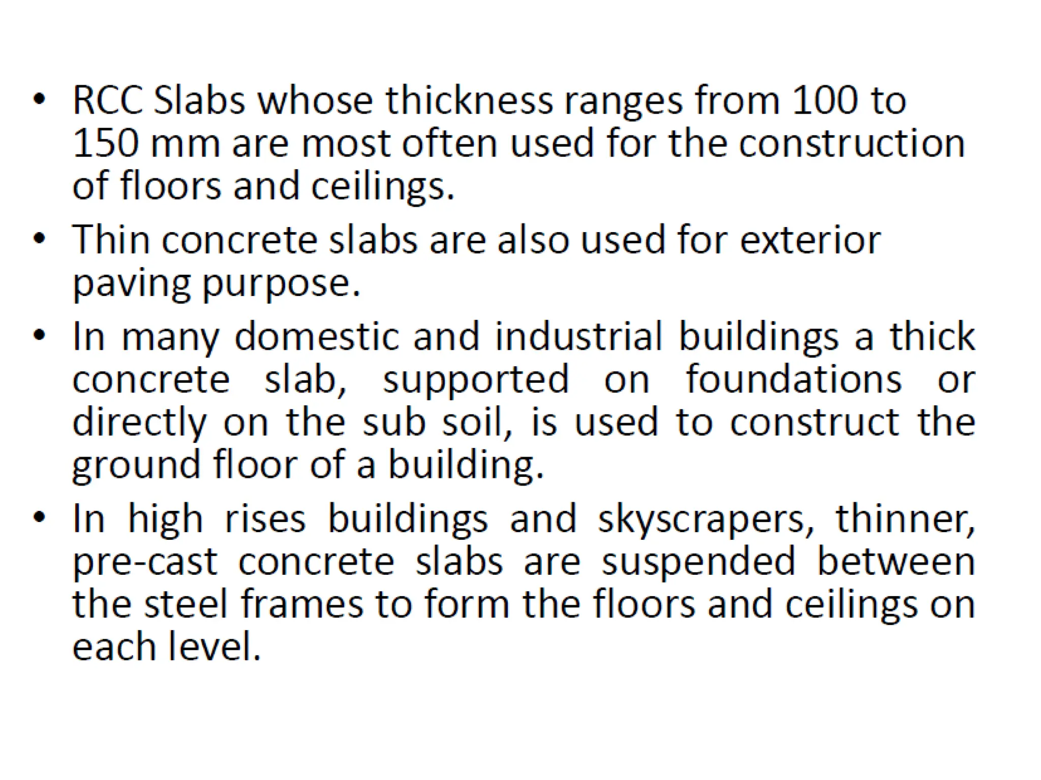 R.C.C. slabs are classified based on shape, support type, support condition, use, sectional configuration, and spanning direction. One-way slabs span in one direction with short spans of 1.80-3.60 m, while two-way slabs span in two directions, suitable for longer spans of 4.5-12 m with heavy loads. Various types of slabs include roof, floor, and water tank slabs, as well as solid, ribbed, and folded plate configurations.