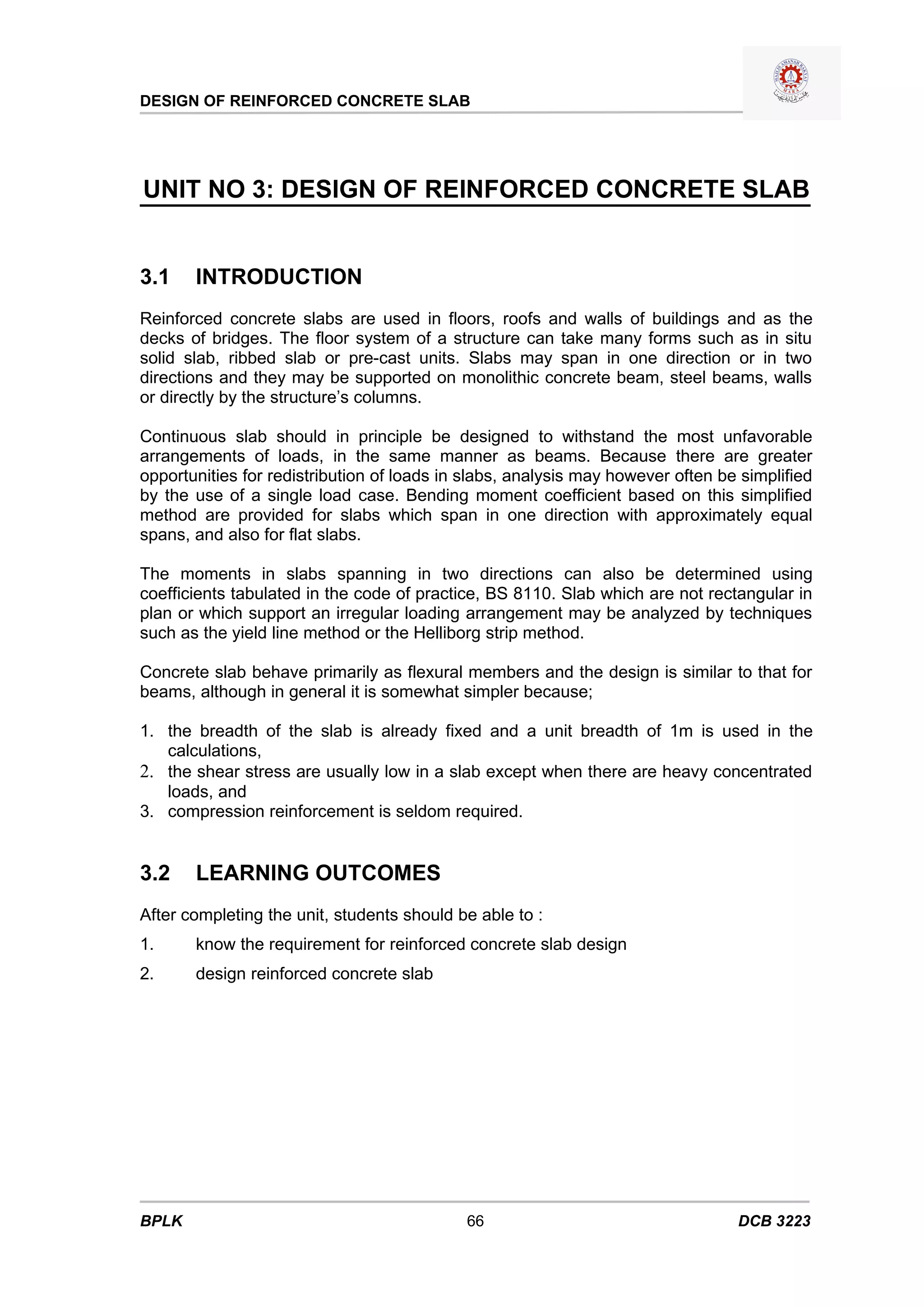 Reinforced concrete slabs are used in floors, roofs, and walls. They can span in one or two directions and be supported by beams, walls, or columns. This document discusses the design of reinforced concrete slabs, including types of slabs, load analysis, shear design, reinforcement details, and provides examples of designing solid slabs spanning in one direction. The goal is to teach students to properly design and analyze reinforced concrete slabs according to code.