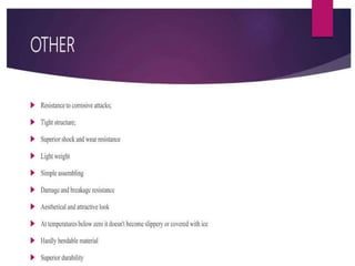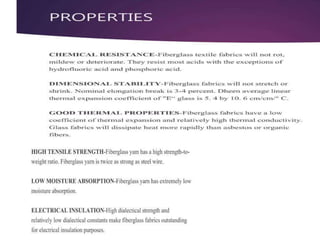 The document discusses various types of fibers that are used as reinforcements in composite materials, including glass, silica, Kevlar, carbon, boron, and silicon carbide fibers. It provides details on some common reinforcement fibers such as glass fiber and Kevlar. The fibers increase the mechanical properties and strength of composite materials, especially in the direction aligned with the fibers. Fiber-reinforced composites find applications in various industries including aerospace, automotive, civil engineering, and sports goods due to their high strength-to-weight ratio and other advantageous properties.
