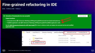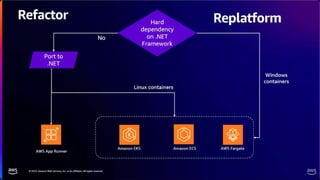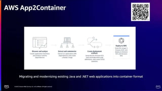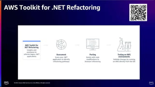 The document discusses modernizing legacy Microsoft workloads and application modernization. It recommends refactoring applications in small, incremental steps rather than a "big bang" approach. The document also promotes using the AWS .NET toolkit to help modernize .NET applications and moving them to AWS. It concludes by thanking the audience and requesting they complete a session survey.