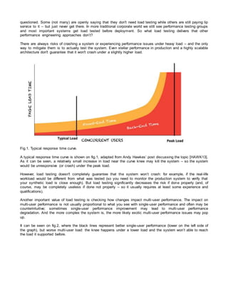 The document discusses the evolving landscape of performance testing, emphasizing that it needs to adapt to modern practices and methodologies such as Agile and DevOps. It highlights various performance engineering techniques, including load testing, and the importance of a multi-faceted approach to mitigate performance risks effectively. Additionally, it addresses the historical context of performance management and the increasing role of cloud services in enabling more efficient and scalable load testing.