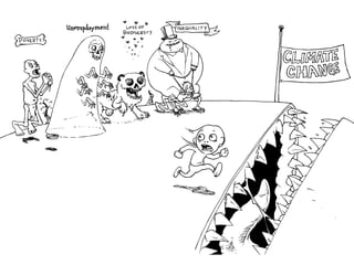 The document proposes 13 policies to address unemployment, inequality, and climate change by shifting the economic system onto a more sustainable path. It argues that traditional economic growth is no longer reducing unemployment or inequality. The policies aim to redistribute income and work hours to reduce the collective environmental footprint, while providing immediate benefits to the majority of people to gain political support. The transition to a new economic system will be a major social and political challenge of the 21st century.