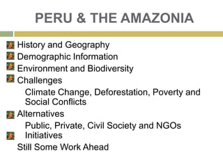The document discusses Peru's Amazonia region, covering its history, geography, population, environment, biodiversity, challenges of climate change, deforestation and poverty, and alternatives for economic growth. It notes that the Amazonia makes up 62% of Peru's territory and contains great diversity of flora, fauna and indigenous groups. While the region faces threats, there are also initiatives from public, private and nonprofit sectors pursuing sustainable development through ecotourism, bio-businesses, education projects and empowering local communities. Overall it argues more can be done to protect the region's natural resources and future through collective action.