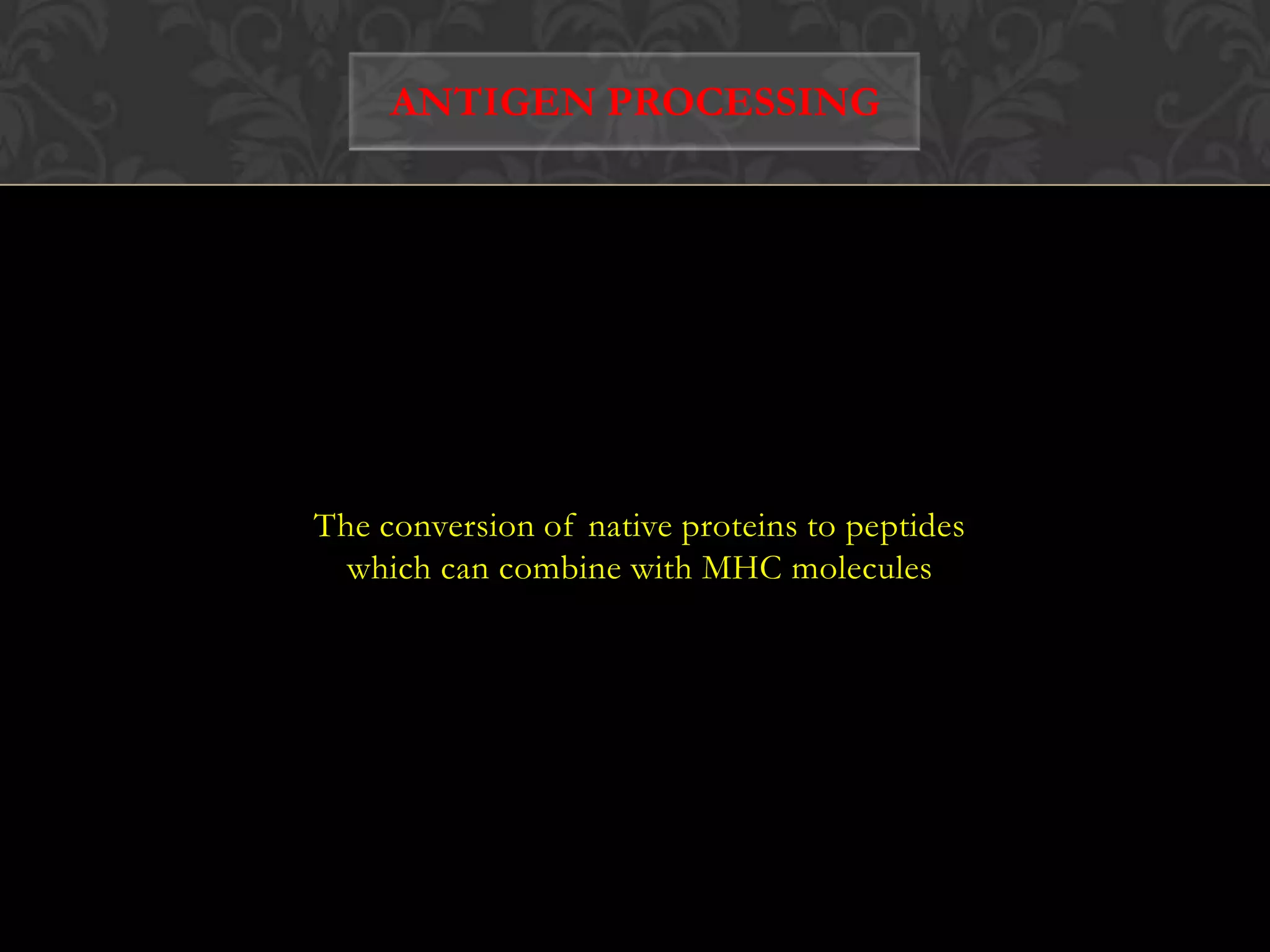 This document summarizes antigen processing and presentation. It discusses how antigens are processed by antigen presenting cells (APCs) like dendritic cells, macrophages, and B cells. Native proteins are broken down into peptides via the proteasome and transported into the endoplasmic reticulum by TAP transporters. There, they bind to MHC class I or II molecules and are presented on the APC surface to CD8+ or CD4+ T cells, respectively. Professional APCs like dendritic cells are most effective at stimulating naive T cells.