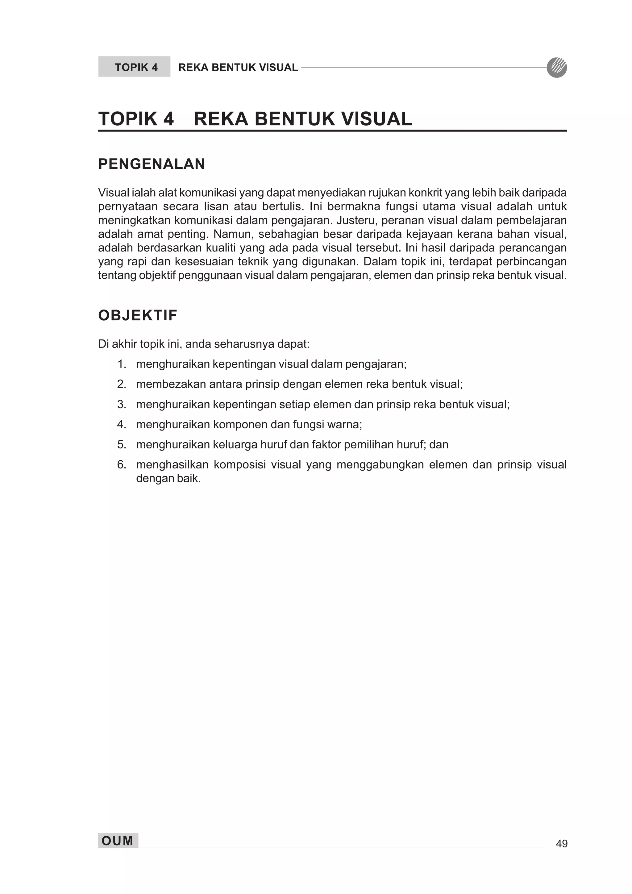 Dokumen ini membahas tentang reka bentuk visual, dengan fokus pada kepentingan visual dalam pengajaran dan elemen serta prinsip reka bentuk. Ia menerangkan pelbagai bentuk visual, ciri-ciri yang diperlukan untuk komunikasi yang berkesan, serta elemen grafik seperti ruang, garis, dan warna. Terdapat juga penjelasan mengenai prinsip reka bentuk seperti simplisiti, dominan, pola, dan harmoni, yang membantu dalam menghasilkan komposisi visual yang menarik dan berkesan.