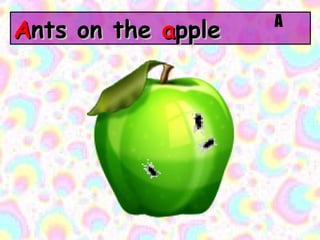 The document lists different animals and objects starting with each letter of the alphabet. It describes ants bouncing on apples, cats bouncing in cars, dogs dancing, eggs on elephants, five fat fish, grass being green, hands on heads, someone itching, jumping in jelly, kitties kissing, lions liking lemons, monkeys in McDonald's, the number nine, an old orange octopus, a pink pig's pool, queens being quiet, rabbits running, snakes in the sun, tigers on tiptoes, umbrellas up, Vincent's violin, washing the window, a fox in a box, yolks being yummy, and a zebra in the zoo.