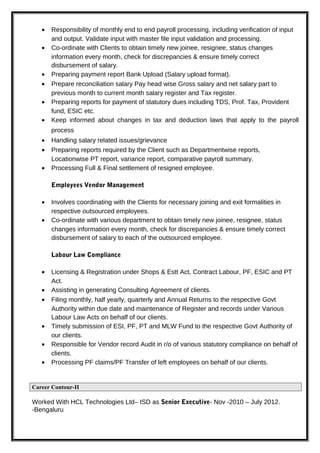 Rekha Sudhakar has over 10 years of experience in payroll and HR operations. She has experience managing payroll for companies with over 1000 employees. Her skills include payroll processing, statutory compliance, recruitment, and employee relations. Her objective is to continue developing her HR skills and contributing value to organizations.