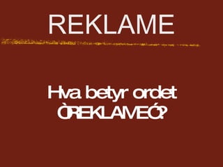 The document discusses the meaning and purpose of advertising. It defines advertising as coming from the Latin word "RECLAMARE" meaning to call out repeatedly. The main goal of advertising is to contribute to the sale and purchase of products. Advertising can take many forms including commercials, posters, signs, brochures, stickers, and products themselves. The purpose of advertising is to get attention, create positive attitudes, provide information on benefits and features of products, build brand recognition, and sell products.