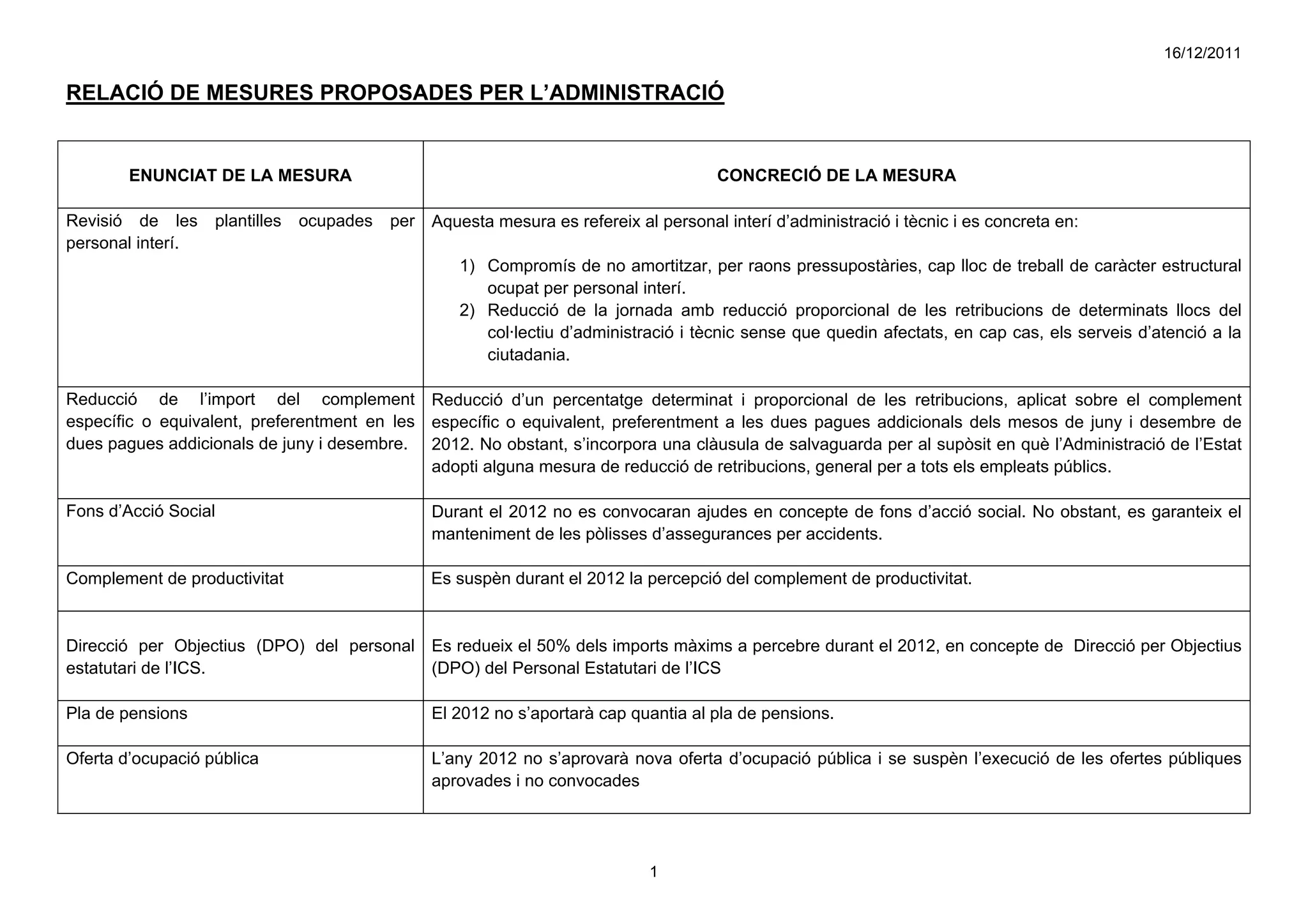 RELACIÓ DE MESURESPROPOSADES PER L’ADMINISTRACIÓ