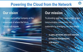 This document provides an overview of a technology company that operates global connectivity solutions through its subsea network and infrastructure, India network and infrastructure, managed network services, and Cloud X platform and ecosystem. The company's vision is to be at the crossroads of where future clouds will migrate and its mission is to provide agile and value-driven global communication solutions for customers by leveraging its core assets of global network and data centers, extensive partnerships, and employees.