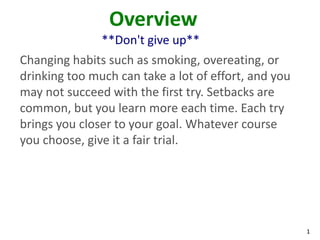 The document discusses effective strategies for overcoming habits such as smoking and excessive drinking, emphasizing the importance of persistence and adaptability in these pursuits. It highlights the significance of reminders and social support systems in recovery, suggesting practical tools like change plans and supportive group attendance. Overall, it encourages individuals to stay committed, seek support from others, and continuously adjust their approaches to achieve long-term success.