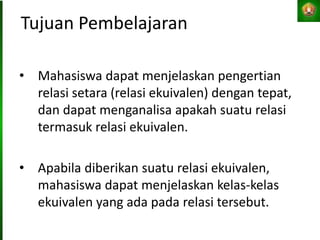 Dokumen tersebut membahas tentang relasi setara, relasi terurut, dan representasi relasi dengan matriks dalam matematika diskret. Tujuan pembelajaran antara lain mahasiswa dapat menjelaskan konsep-konsep tersebut dan menganalisis serta merepresentasikan berbagai relasi.