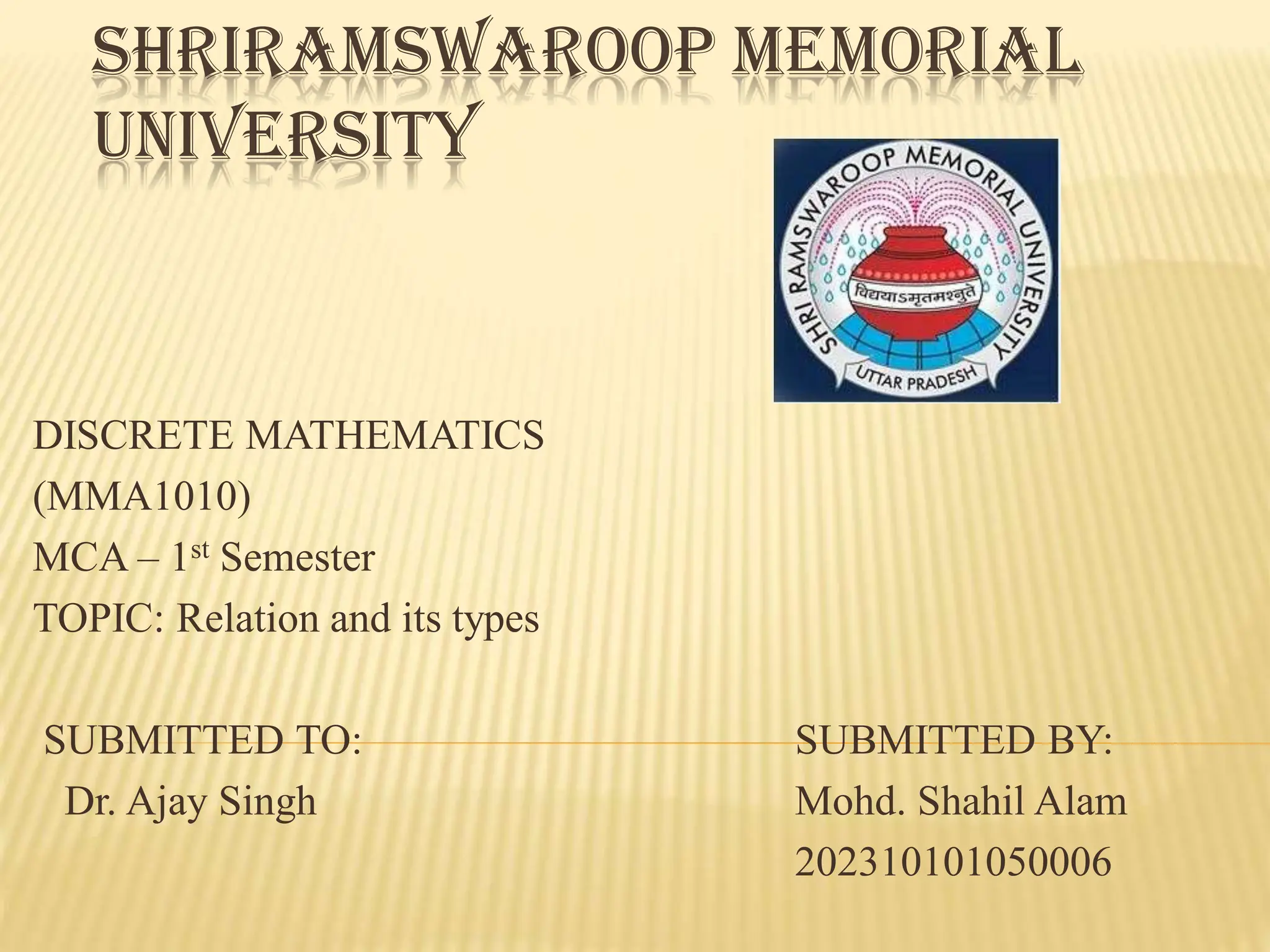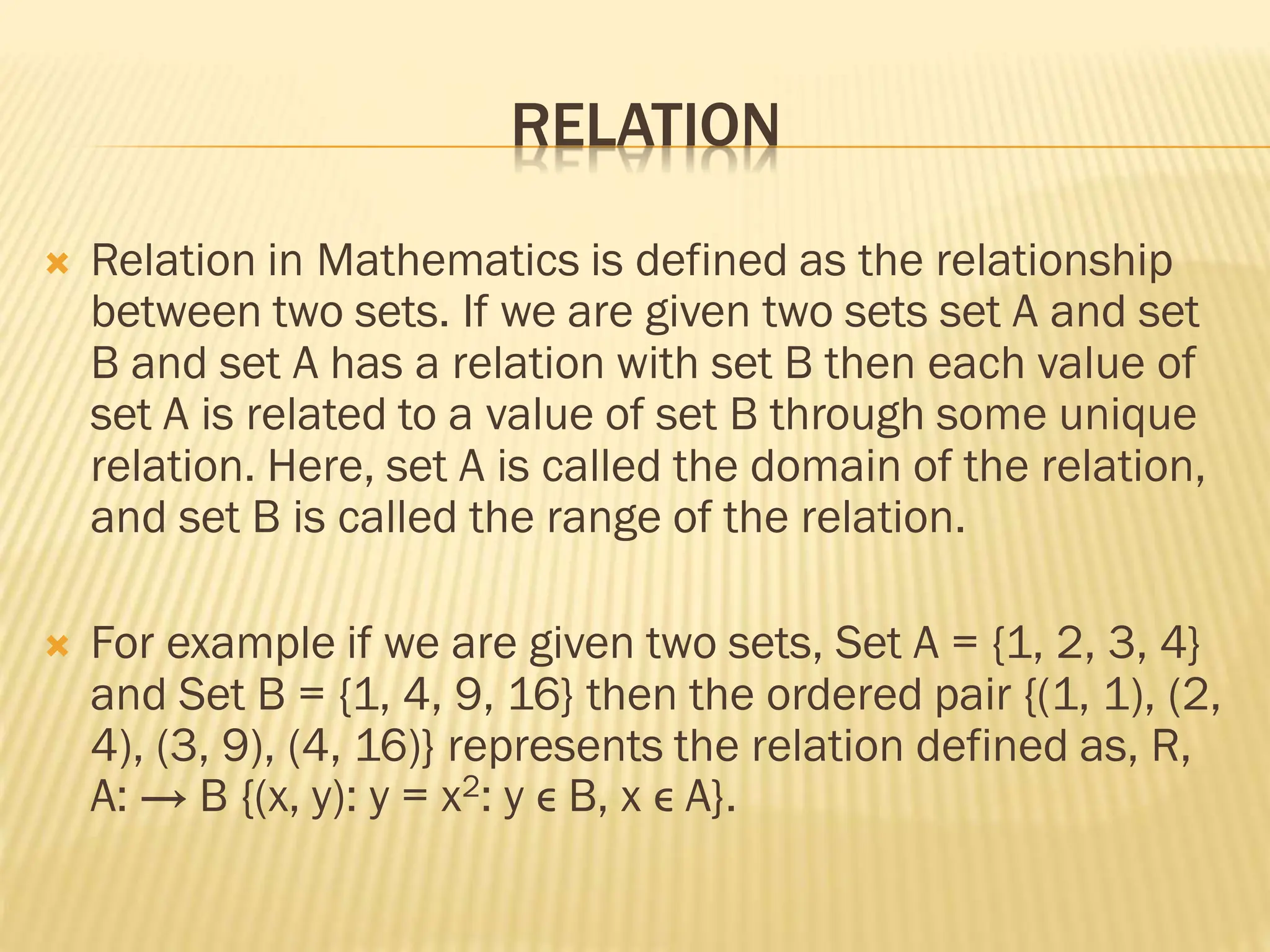 The document explains relations in discrete mathematics, defining them as the relationships between two sets, denoted as the domain and range. It describes various types of relations, including empty, universal, identity, inverse, reflexive, symmetric, transitive, and equivalence relations. It also notes that while all functions are relations, not all relations are functions.