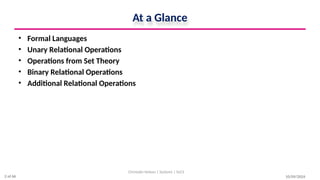 The document discusses formal languages related to relational databases, focusing on relational algebra and relational calculus, highlighting their expressive power and relationships. It covers unary and binary relational operations, including select, project, join, and various set theory operations, while explaining their procedural nature and how they relate to SQL. Additionally, it details types of joins and operations applicable to relations, emphasizing practical applications and examples.
