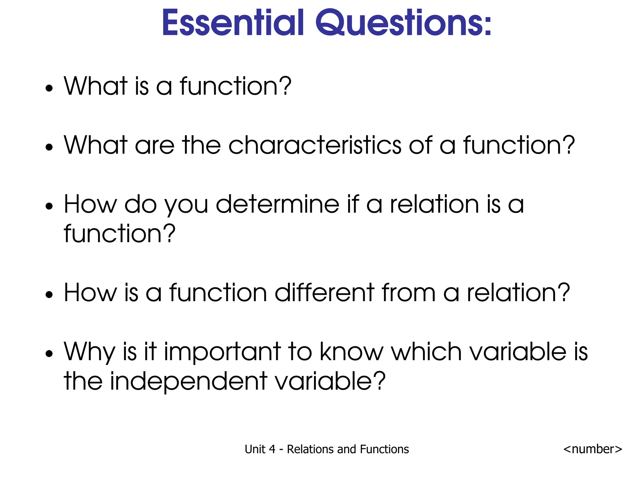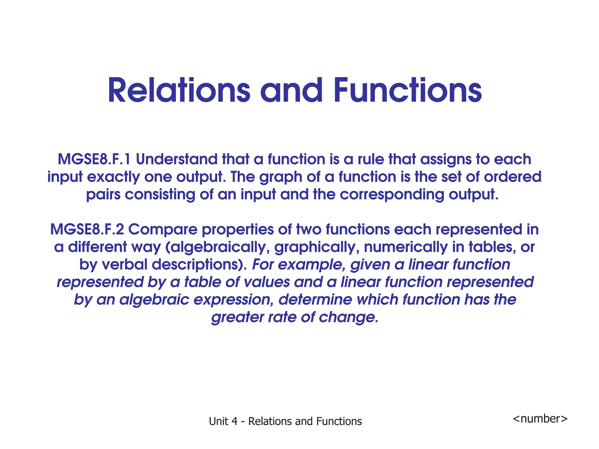 Unit 4 focuses on relations and functions, defining a function as a rule that assigns each input exactly one output, with accompanying examples and tests to assess understanding. Key concepts include identifying functions through ordered pairs, the vertical line test, and real-life applications of domain and range. Students learn the importance of independent and dependent variables through various practical examples.